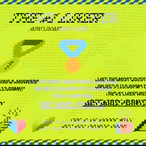 Will you be the #1 Liker and get 6001 points?! How many questions and answers can you like? BE the #1 LIKER on DEC 9 (10:00PM to 12:00MN) & get 6001 points! The top 2 to 10 users will get 601 points each. WE REALLY, REALLY LIKE YOU!