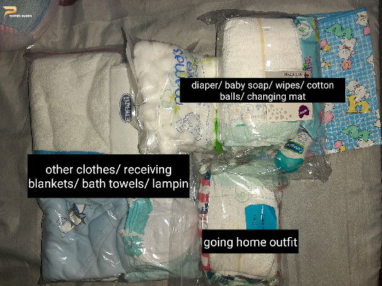 Again it depends kung san kau manganganak (how many days stay period= quantity ng clothes per pack) 1. Receiving blankets 2. Bath towel 3. Lampin 4. Long sleeve tie shirt 5. Short sleeve tie shirt 6. Pajamas 7. Caps/ mittens/ booties 8. Diapers 9. Cotton balls 10. Changing mat 11. Baby bath soap 12. Tiny cotton buds 13. Going home outfit- includes: 1frogsuit, 1 swaddle, 1 diaper, 2 lampin
