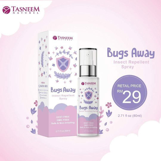 BUGS AWAY (Insect Repellent) DESCRIPTION: Bugs Away is specially formulated to protect your kids from insects such as mosquitoes, bed bugs, ants and etcetera. INGREDIENTS: Citronella Oil, Potassium Sorbate, Aqua. HOW TO USE: Shake well before use. Spray directly on entire area of skin to be protected. Re-apply as needed. PRECAUTION: Spray onto palms then dab onto face. Avoid eyes and mouth area. Adult supervision is recommended for kids with younger age during application. For sensitive skin, kindly conduct patch test before use. Spray on your arms and wait for 24 hours. If there is any reaction occurs, this insects repellent might not suitable for you.
