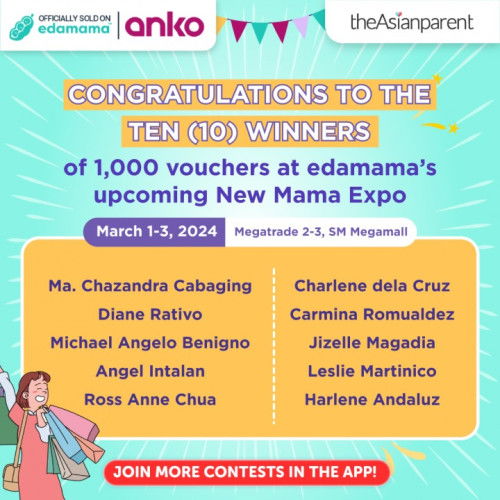Palakpakan naman natin ang 10 winners who gets P1,000 voucher EACH to enjoy at edamama’s upcoming New Mama Expo 2024 this March 1-3 at Megatrade 2-3, SM Megamall. If gusto niyo rin manalo tulad nila, sumali rin sa iba pang mga contests DITO: https://community.theasianparent.com/contests?lng=ph