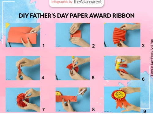 Here is an easy DIY Paper Award Ribbon that your kid(s) can make as a gift this Father's Day. Things you will need: 2 sheets of red paper (or any other colour) Yellow paper Black marker Scissors Glue Step 1: Start by folding a sheet of paper in half (along the longer side). Then cut along the middle to get two long strips of paper. Step 2: Start folding the sheet of paper (the strip) making accordion folds all the way till the end. Step 3: This is how it should look like. Step 4: Push the “accordion” together. Fold it in half. Step 5: Glue together on one side. It should now look like a fan. Step 6: Do these same steps with the other strip of paper. Step 7: Now you have two fans and you need to glue them together. Step 8: Cut out a circle from the yellow paper and write 'Best Dad Award' or any choice of message with a marker and stick it on red circle fan. With the other sheet of red paper cut out two ribbons. Step 9: Stick those under the red circle fan. Voila!