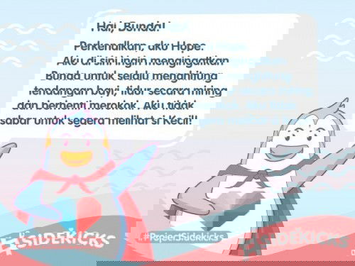 Hai, Bumil! Hope, maskot Project Sidekicks mengingatkan untuk: menghitung tendangan janin, tidur miring, dan berhenti merokok! Semoga Anda memilki kehamilan yang sehat! #ProjectSidekicks #TAPSidekicks