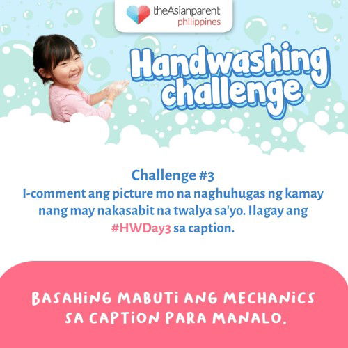 Daily Challenge #3 Manalo ng Php100 worth of Robinsons Supermarket GC! 1. Pumunta sa https://tap.red/pm3mr at i-click ang “Participate” kung hindi mo pa ito ginagawa. 2. Magpicture nang naghuhugas ng kamay nang may nakasabit na twalya sa kahit anong parte ng katawan mo. 3. I-post as comment sa post na ito. Huwag kalimutan ang #HWDay3. 4. Ang may pinakacreative na picture ang mananalo. 5. Submission of entries ends on 11:59pm tonight. I-aannounce ang winner for daily challenge #3 sa April 3, 2020.