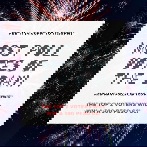 How many polls can you answer? The mechanics of our game are simple: 1. Like this post and comment "I'm voting!" to officially join our mini game. 2. On February 11 (4:00 PM to 11:59 PM), vote on as many polls as you can. 3. That's it. Simple lang ulit ang game, di ba? 4. If you're one of the top 2 voters, you'll win a 300 PESO GC. We'll be announcing the winners on February 12 (4PM), so stay tuned for that. 5. Ready? Game!