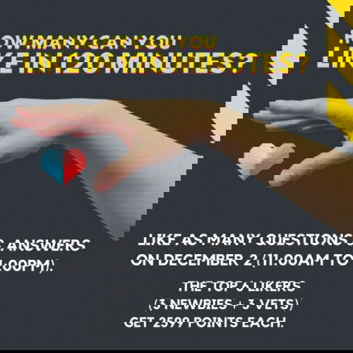 Let's play a liking game! How many questions and answers can you like? Will you be one of the top 6 users (3 newbies + 3 vets) to get 2599 points each? Like as many questions and answers (December 2, 11:00am to 1:00pm). Don't forget to like this post and register here: https://community.theasianparent.com/contest/december-2-extreme-games/834?lng=en