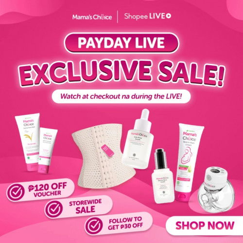 PAYDAY na, CHECKOUT na sa Mama's Choice! Sa Shopee Live, marami kang makukuhang vouchers and more: 💖 P120 OFF 💖 STOREWIDE SALE 💖 EXTRA P30 OFF, JUST FOLLOW! See you there, Mama!