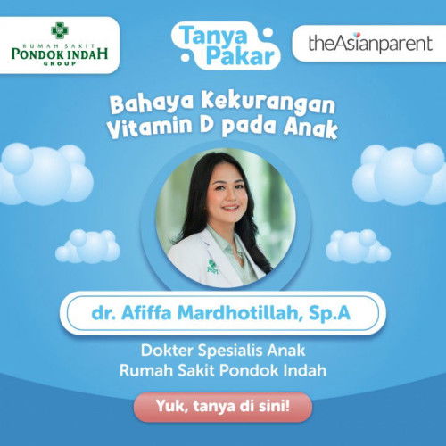 Hai Parents, saya dr. Afiffa Mardhotillah, Sp.A, seorang spesialis anak di Rumah Sakit Pondok Indah! Saya akan menjawab pertanyaan-pertanyaan Parents terkait bahaya kekurangan vitamin D pada anak. Parents mungkin penasaran soal: ⬤ Kira-kira kapan dan berapa lama si Kecil harus berada di bawah sinar matahari agar kebutuhan vitamin D-nya terpenuhi? ⬤ Beraktivitas di bawah sinar matahari aja cukup nggak sih untuk memenuhi kebutuhan vitamin D? ⬤ Apa tanda si Kecil kekurangan vitamin D? ⬤ Sekiranya si Kecil kekurangan vitamin D, penyakit apa sih yang bisa muncul? Karena itu, jika Parents memiliki pertanyaan terkait topik ini, Parents bisa langsung mem-posting pertanyaan pada topik 'Tanya Pakar' dengan cara: 1. Klik tombol biru pada pojok kanan bawah aplikasi. 2. Klik ‘Tanyakan sesuatu atau ceritakan pengalamanku selama hamil dan mengasuh si Kecil’. 3. Klik 'Ganti Topik', kemudian klik 'Cari Topik' dan ketik 'Tanya Pakar'. Klik tulisan 'Tanya Pakar' tersebut. 4. Tuliskan judul dan deskripsi pertanyaan Parent, kemudian Parent dapat menambahkan detail berupa foto atau link jika dibutuhkan. 5. Klik ‘Post’ untuk memposting pertanyaan. Saya akan dengan senang hati membalas pertanyaan-pertanyaan Parents terkait vitamin D pada anak selama seminggu ke depan, ya! Sampai jumpa✨