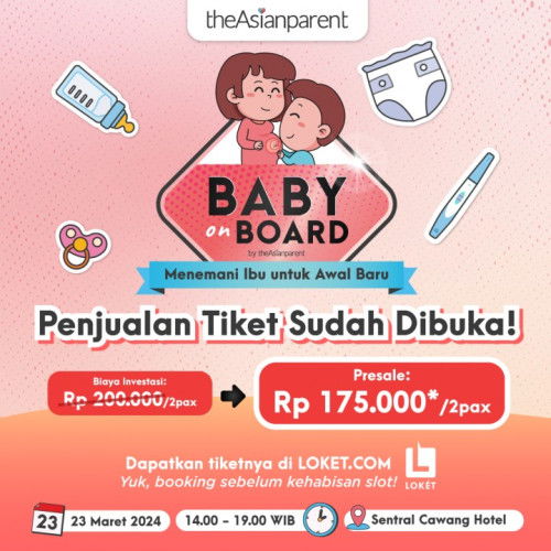📢 Persediaan Presale tiket Baby on Board 2024 hampir habis, Parents! 😱 🤩 Cuma dengan Rp175.000,-/ pax (harga normal Rp200.000,-), kamu dan Paksu bisa datang ke acara Baby on Board dan dapat goodie bag senilai jutaan Rupiah! Segera beli sebelum kehabisan, Parents. 👆 Klik di sini: https://www.loket.com/event/babyonboard2024