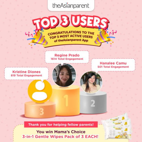 This time, we are awarding the users na may pinakamaraming engagements sa mga posts with fellow parents sa app! Kaya may prize ang mga TOP 3 MOST HELPFUL USERS on a bi-weekly basis! 📱CONNECT MORE, COMMENT ON MORE QUESTIONS & WIN NEXT TIME! Next period will be on April 15-26, 2024!🏆 Top 1 - Regine Prado Top 2 - Hanalee Camu Top 3 - Kristine Diones Our Mama's Choice brand representative will contact you via email! PRIZE from Mama's Choice: Gentle Wipes Pack of 3 EACH! Kung gusto makasali next time, comment lang ng "Susunod ako!"