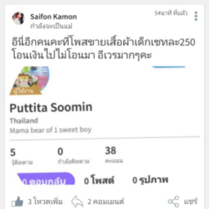 อีเวรคนนี้โกงหลอกลวงมาหลอกขายของลูก2คนแล้วไม่มีปันยาทำมาหาแดกต้องมาหลอกขายเสื้อผ้าเด็ก น่าสมเพศจริงๆ เวรกรรมมันมีจิงมึงอยู่ไม่เป็นสุขแน่อีดอก