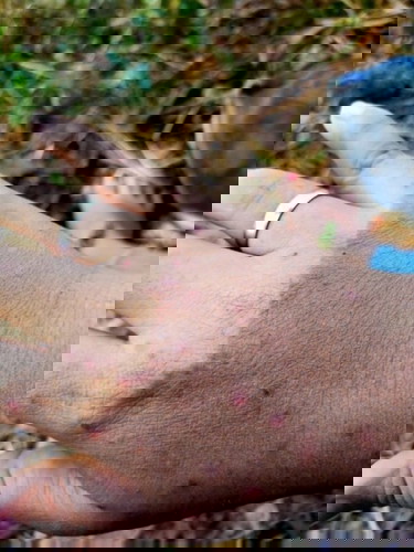 ตอนนี้เป็นเม็ดคันขึ้นเต็มตัวเลยค่ะ แต่พยายามทาออยละไม่เกา